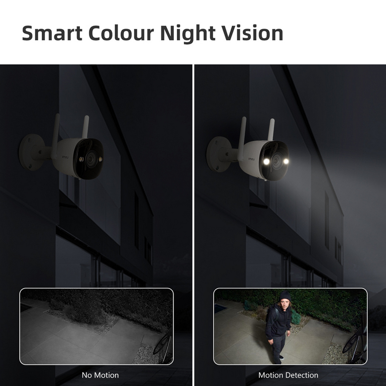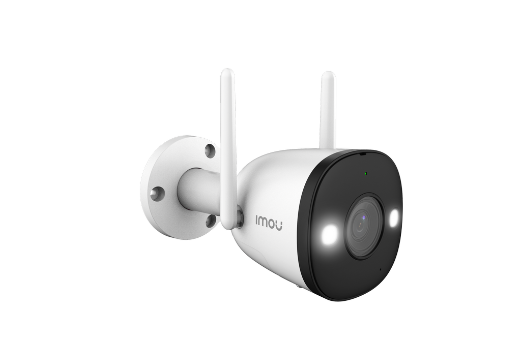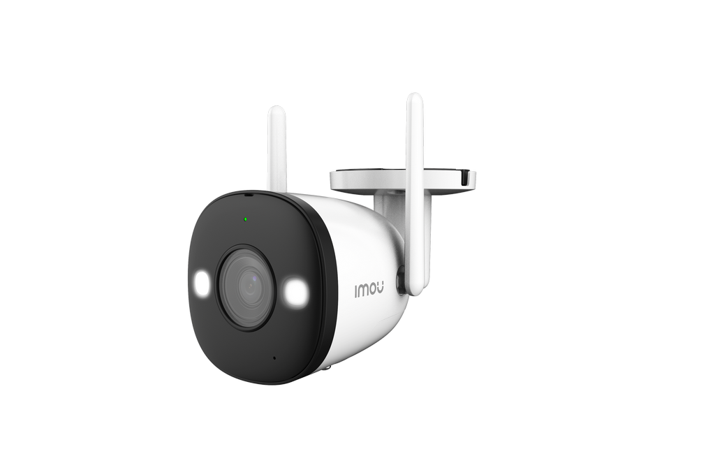 Neli IMOU Bullet 2 Wi-Fi kaamerat (2MP, Full HD). Need annavad selge värvipildi ka pimedas tänu Full Color tehnoloogiale ja sisseehitatud prožektorile. Öövaatluse ulatus on kuni 30 meetrit ning 110 dB sireen aitab ebasoovitavaid külalisi eemale hoida.